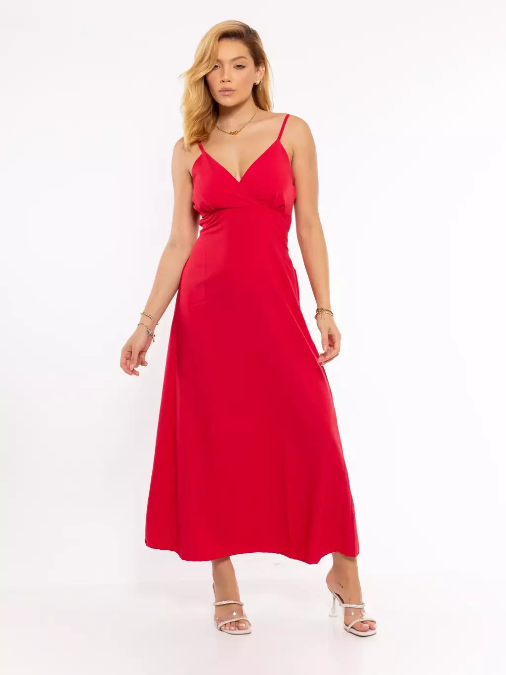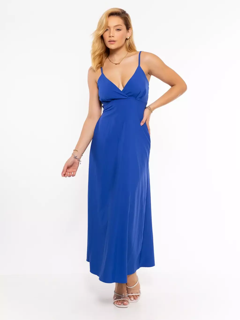 Vestido longo com laço na cintura.